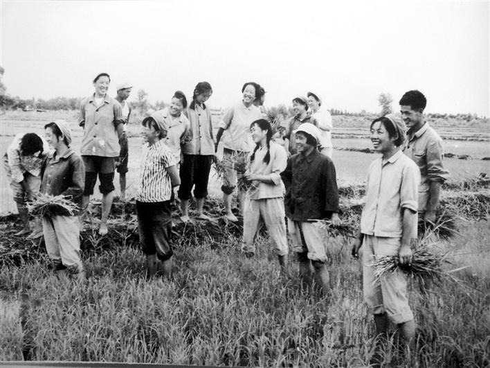 王震将军(前排左三)在塔里木河农业大学(现塔里木大学)视察工作。