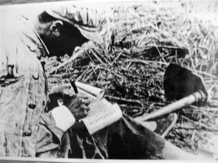 建校初期,田野当课堂,师生们在胡杨树下上课。