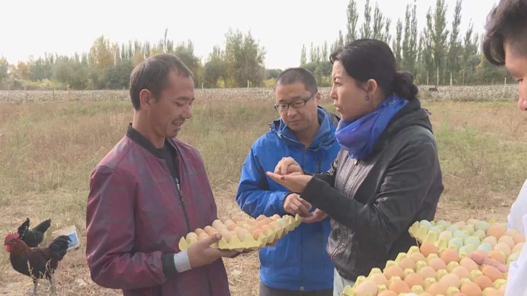 格明古丽•木哈台说(图右二),一开始农民们都不愿意养鸡,觉得鸡不好养且养殖效益不高,最后就剩下了吐尔洪•伊斯坎迪尔一家愿意试一试。为了打开这个致富通道,格明古丽•木哈台隔三差五就要带着团队人员过来查看。