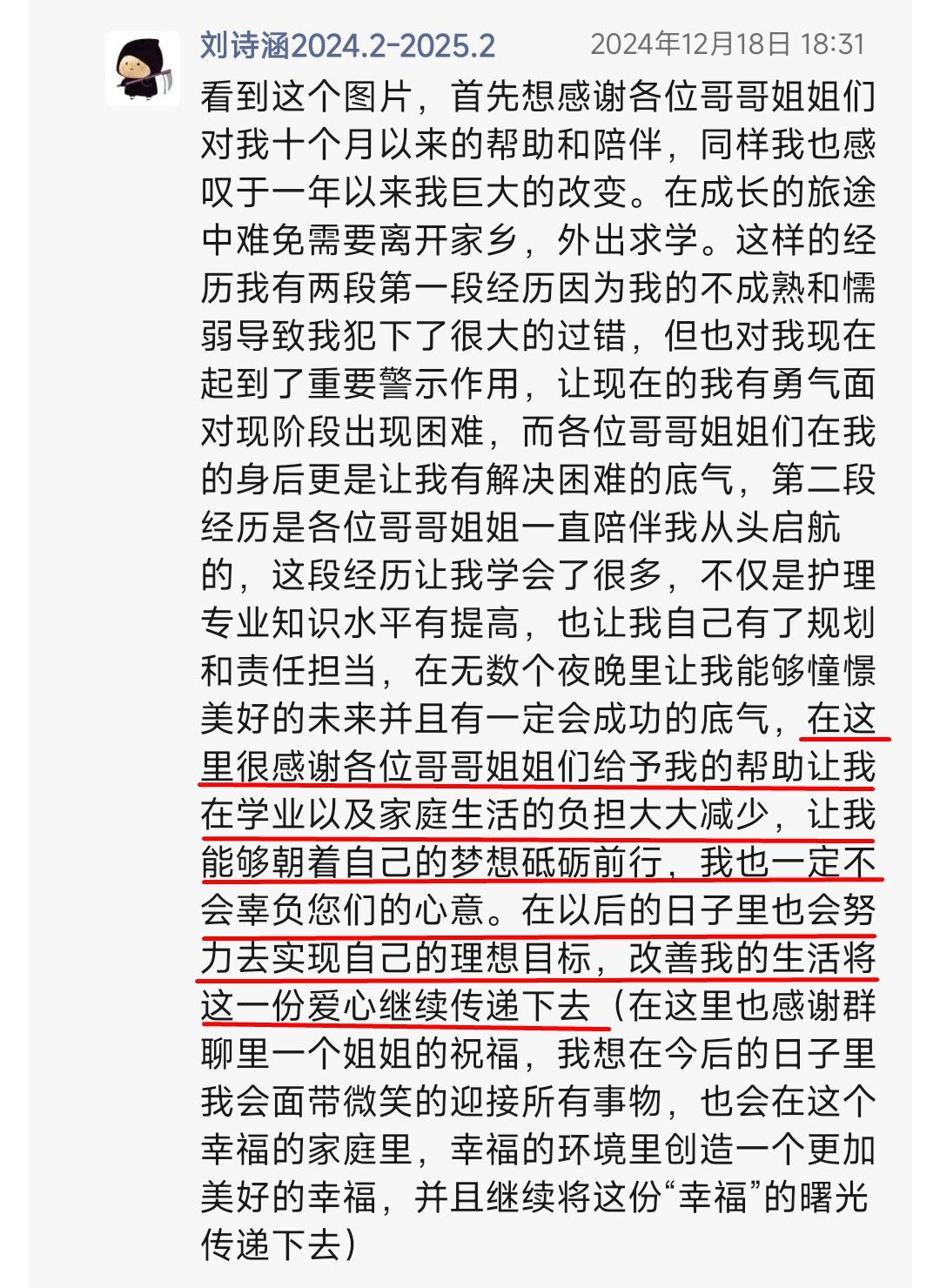 “我会继续把这份爱传递下去,有一份热,发一份光,但愿所有孩子能如愿求学,完成人生理想,做顶天立地的人。”