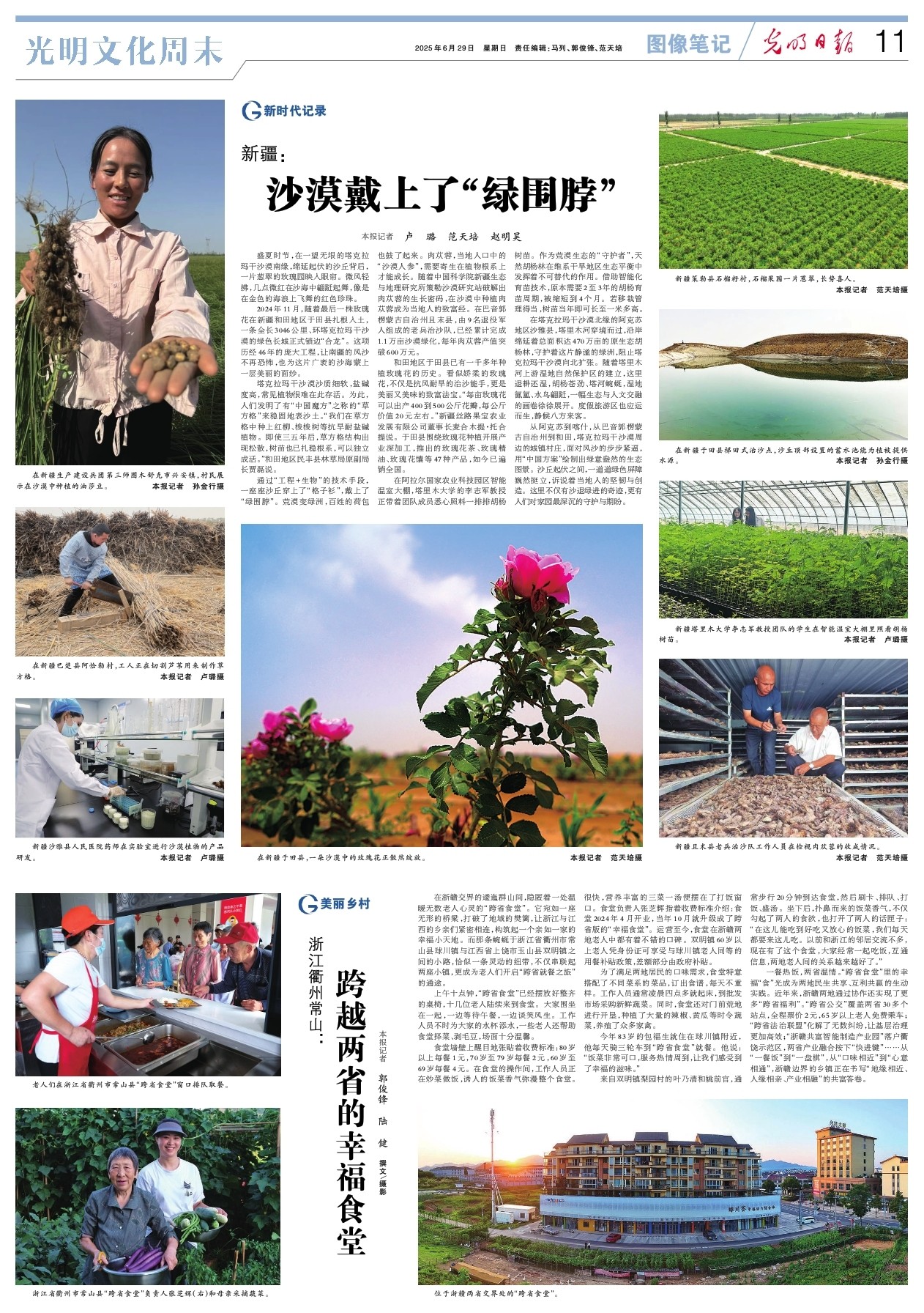 从阿克苏到喀什,从巴音郭楞蒙古自治州到和田,塔克拉玛干沙漠周边的城镇村庄,面对风沙的步步紧逼,用“中国方案”绘制出绿意盎然的生态图景。沙丘起伏之间,一道道绿色屏障巍然挺立,诉说着当地人的坚韧与创造。这里不仅有沙退绿进的奇迹,更有人们对家园最深沉的守护与期盼。