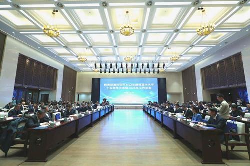 钟登华讲话,代表组长单位中国农业大学对长期以来关心指导帮助对口支援塔里木大学工作的教育部、兵团领导表示感谢,对塔里木大学的发展成就表示祝贺,对团队高校的倾情付出和无私奉献表示敬意,对浙江大学承办此次会议表示感谢,强调了此次会议的重要意义。他指出,今天签署了新一轮对口支援协议,制定了新目标新举措,赋予了新使命新任务。各支援高校要提高政治站位、坚决扛起党中央赋予的政治责任,强化责任担当、加快谋划“十五五”时期对口支援新蓝图,发挥团队优势、奋力推动对口支援取得新成效。要始终加强统筹,协同发力,同频共振,开拓创新,不断提升,发挥优势,久久为功,以更高标准在对口支援工作中展现新作为,打造南疆特色、全国示范的对口支援工作标杆,为以教育之力续写南疆奇迹作出新的更大贡献。