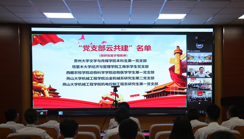 7月1日下午,经管院工商系学生党支部与燕山大学机械工程学院的冶金机械系研究生第一党支部、机电控制工程系研究生第二党支部、贵州大学文学与传媒学院本科生第一党支部、西藏农牧学院动物科学学院动物医学学生第一党支部携手开展党支部“云共建启动仪式”暨共建党支部首次联合支部活动。