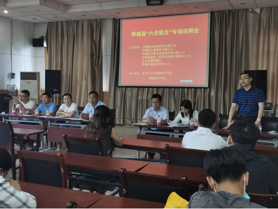 为做好2020届毕业生就业创业工作,科学应对疫情不利影响,有效拓宽毕业生就业渠道,6月6日,植科院联合拜城县六家企业在老植科楼四楼多功能厅举行拜城县“六企联合”专场招聘会。学院党委副书记朱天生主持。
