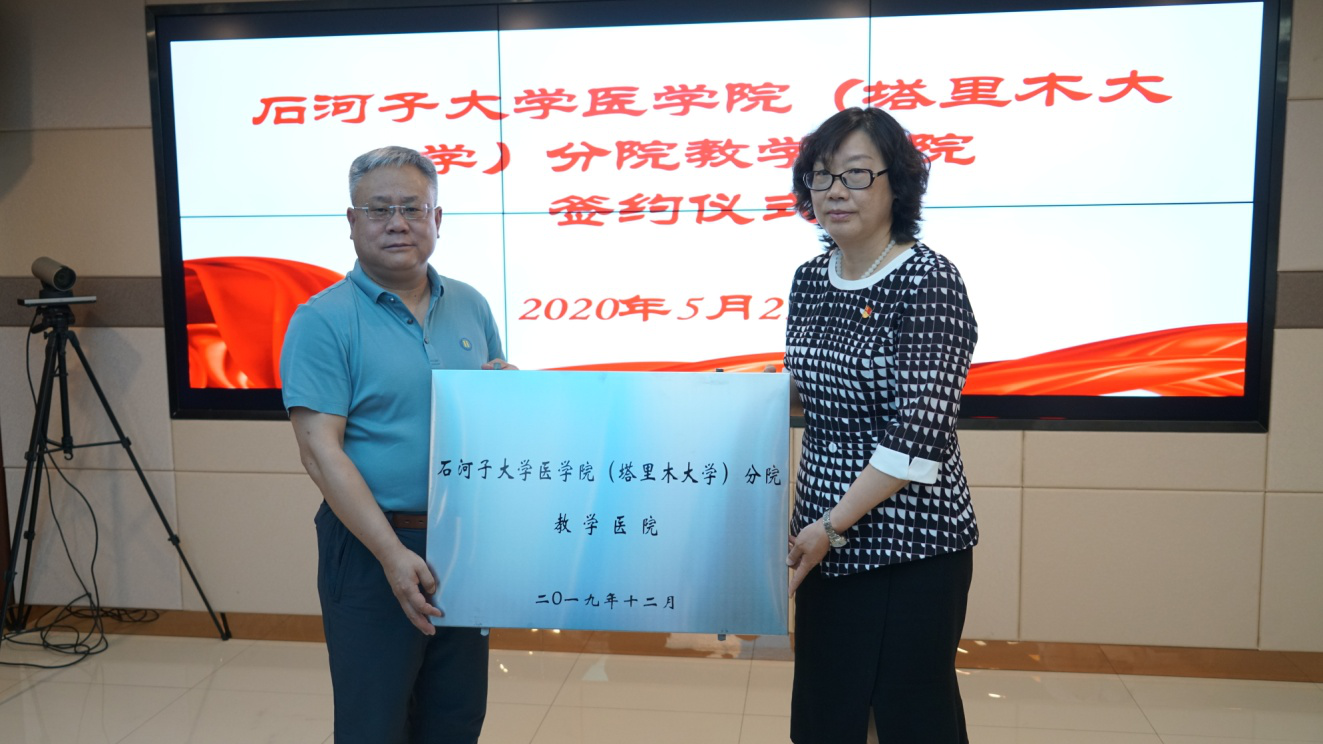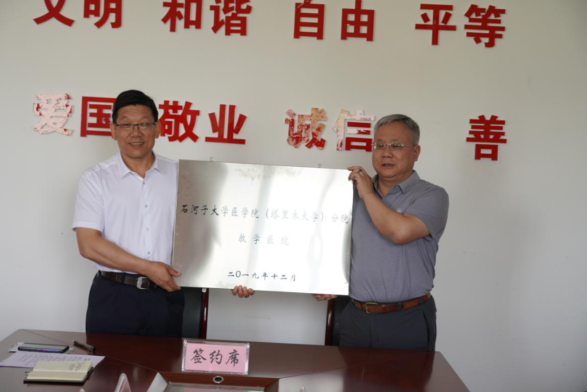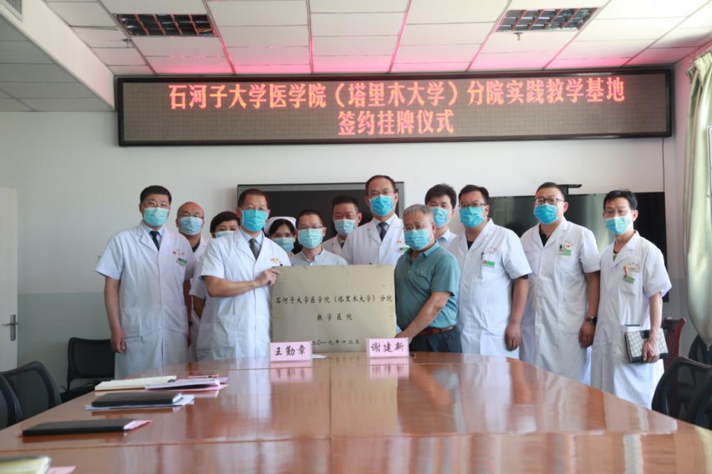 医学院谢建新与喀什地区第一人民医院、第三师医院、克州人民医院、图木舒克市人民医院分别签订《教学医院协议书》,并举行实践教学医院授牌仪式。