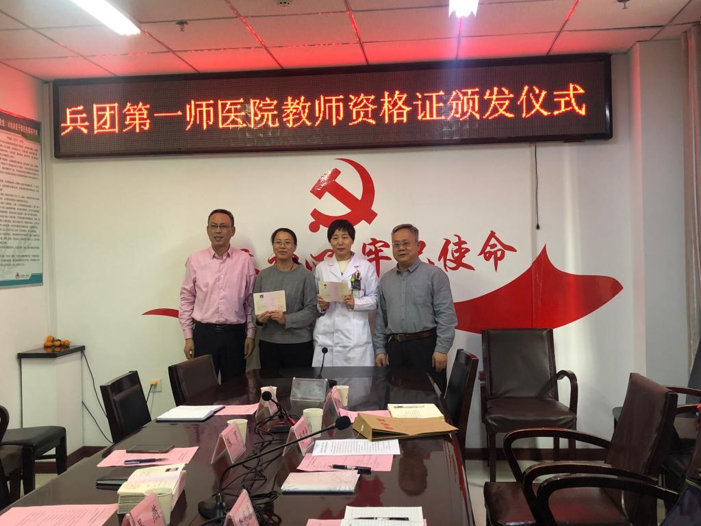 谢建新、陈军为兼职教师代表颁发了高校教师资格证。双方院领导签订了《石河子大学医学院(塔里木大学)分院与第一师医院关于建立临床教学基地协议书》。陈军说,第一师医院会在今后的临床教学工作中高度重视并大力提供临床教学保障,为南疆培养输送更多更优秀的医学人才,为南疆医疗卫生事业发展做出新的更大贡献。