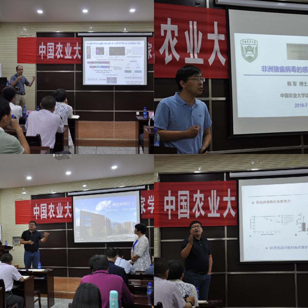 7月8日,中国农业大学动物医学院党委书记李青山,副院长张国中、韩军,特聘教授刘平黄,董彦君副教授一行来到动物科学学院学术交流,在动科楼218室举行学术报告会。报告会由动物科学学院院长陈伟教授主持。