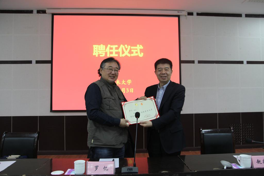 4月3日上午,塔里木大学举行客座教授聘任仪式。党委书记赵光辉为原新疆广播电视大学党委副书记、纪委书记,新疆大学新闻与传播学专业研究生导师罗忆教授颁发聘书,聘任罗忆教授为我校客座教授。人文学院院长肖涛、传媒系师生代表参加聘任仪式,仪式在行政楼B座117室举行。