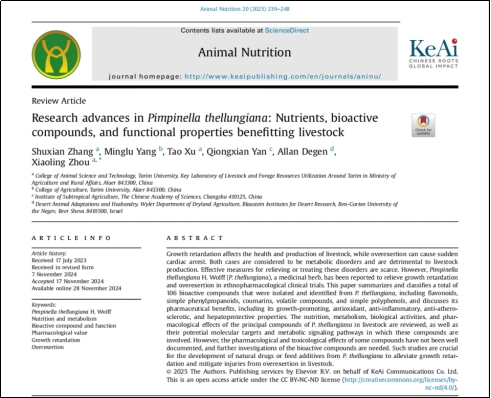 近日,我校动物科学与技术学院硕士研究生张淑贤在国际农林科学领域Top期刊《Animal Nutrition》(中科院一区,IF=6.6)上发表了题为《Research advances in Pimpinella thellungiana: Nutrients, bioactive compounds, and functional properties benefitting livestock》的研究成果。张淑贤为第一作者,周小玲教授为通讯作者。该研究得到国家自然科学基金和兵团科技项目的支持。