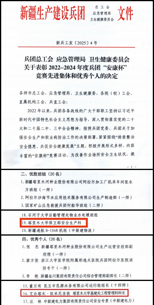 近日,兵团总工会、兵团应急管理局、兵团卫生健康委员会联合印发《关于表彰2022-2024年度兵团“安康杯”竞赛先进集体和优秀个人的决定》,我校保卫部安全生产科获得优胜班组,基建处工程管理科科长艾合塔木·依米尼亚孜获得优秀个人。