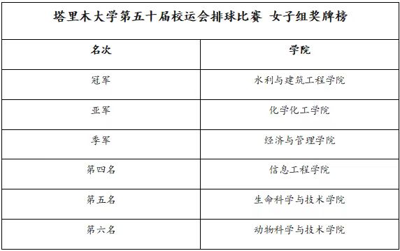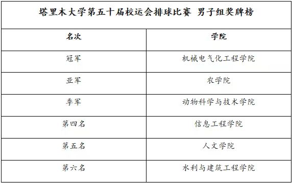 4月6日,塔里木大学第五十届运动会排球比赛在新校区(东扩区)体育馆圆满结束。最终,机械电气化工程学院男子排球队、水利与建筑工程学院女子排球队分别获得男排、女排冠军。