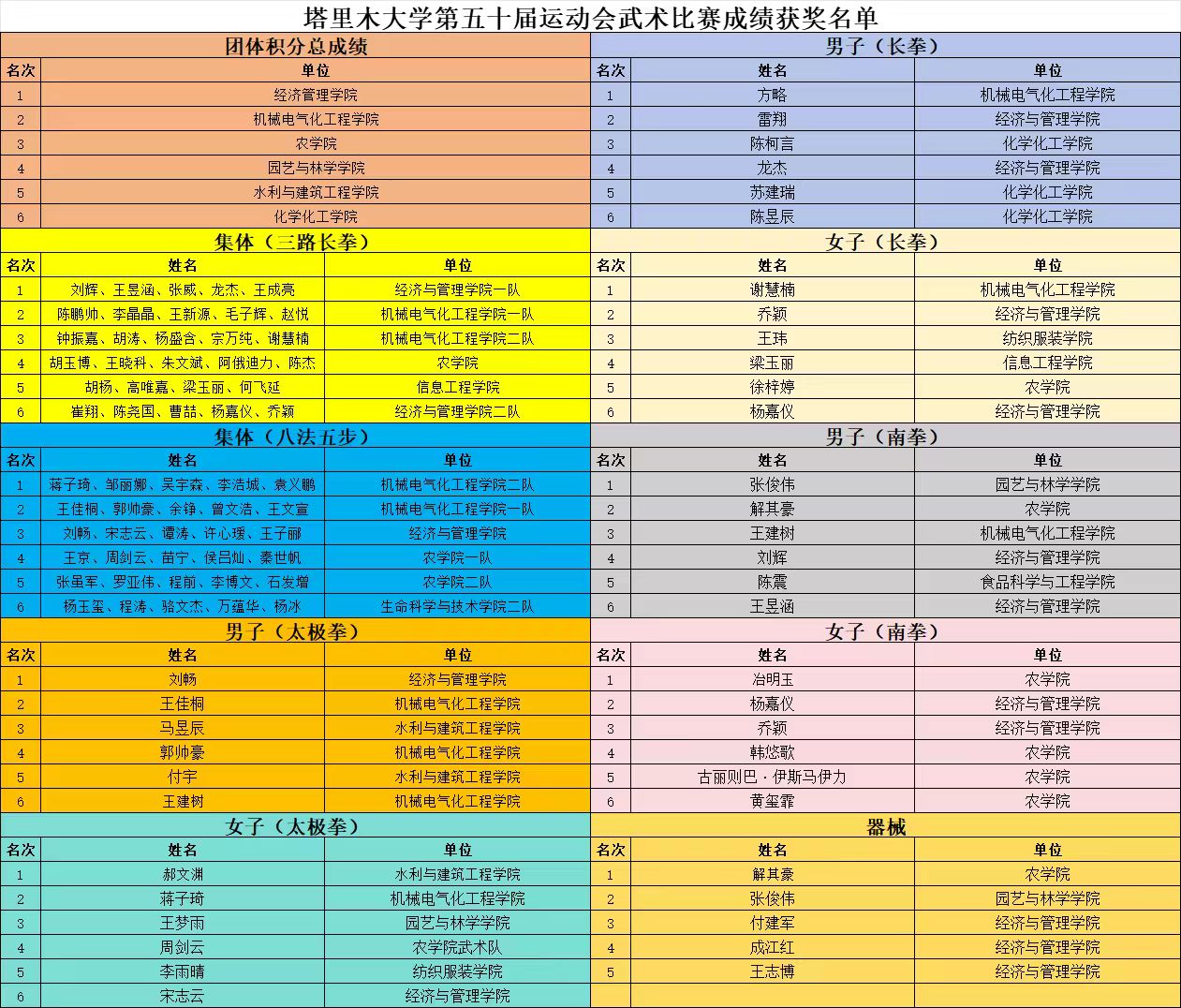 4月6日,塔里木大学第五十届运动会武术比赛在综合体育馆圆满结束。经过激烈角逐,在集体项目中,经济与管理学院获得三路长拳项目冠军,机械电气化工程学院获得八法五步项目冠军;在个人项目中,各单项冠军也花落各家。