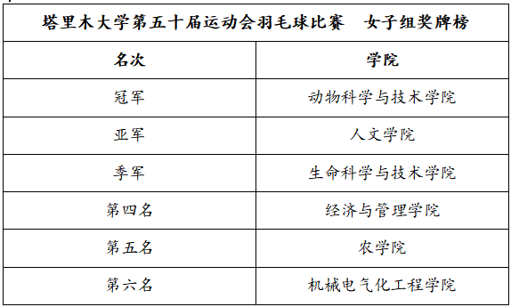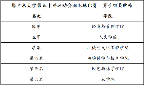 4月12日,塔里木大学第五十届运动会羽毛球比赛在乒羽馆圆满结束。最终,经济与管理学院男子羽毛球队、动物科学与技术学院女子羽毛球队分别获得男子羽毛球团体赛、女子羽毛球团体赛冠军。