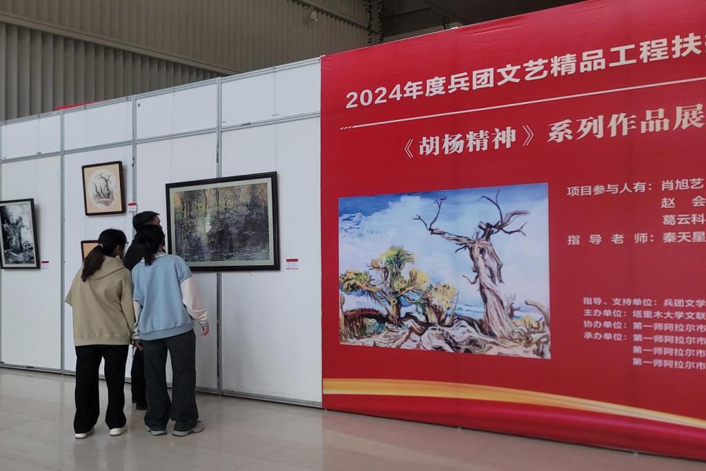 本次展览由塔里木大学文联主办,第一师阿拉尔市美术家协会、第一师阿拉尔市新时代文明实践中心承办,第一师阿拉尔市文联,阿拉尔市文化馆协办。展览以“胡杨精神”为主题,共展出胡杨风景作品56幅,旨在通过这些文艺作品展现胡杨的顽强与壮美。(文/肖旭艺 摄/赵澳)