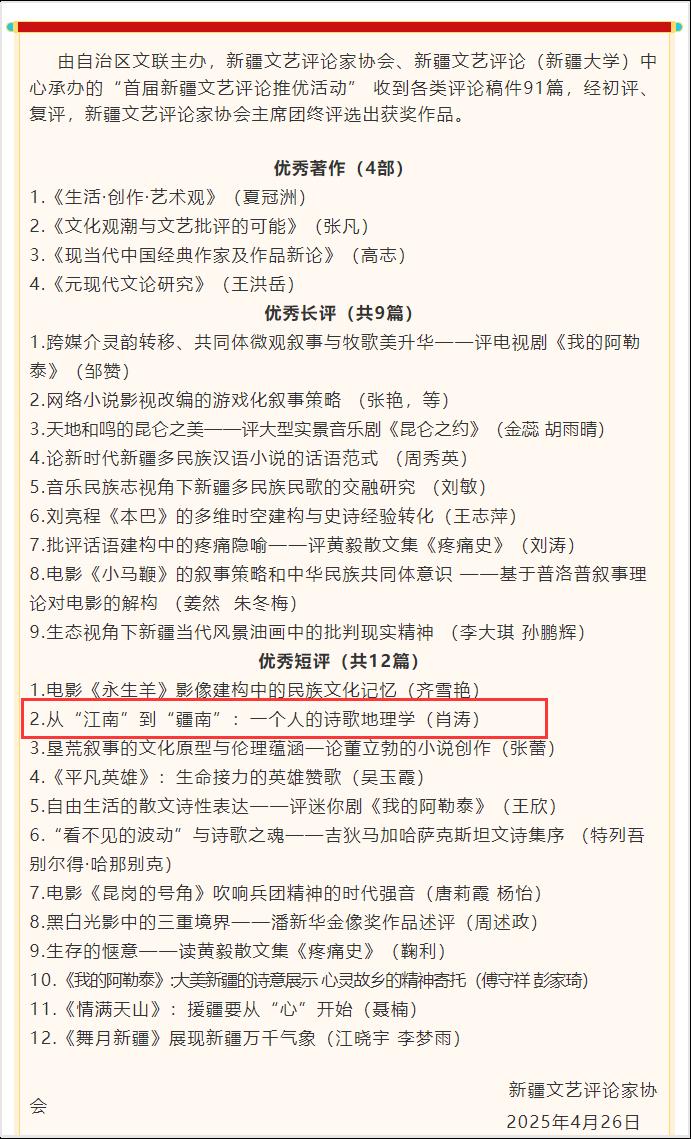 近日,新疆文艺评论家协会公布了首届新疆文艺评论推优活动评选结果。我校人文学院院长肖涛教授的作品《从“江南”到“疆南”:一个人的诗歌地理学》获得优秀短评。