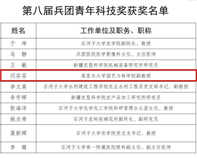 近日,兵团党委组织部、兵团人力资源和社会保障局、兵团科协、兵团团委联合印发《关于表彰第八届兵团青年科技奖获奖者的决定》,我校园艺与林学学院闫芬芬教授获得兵团青年科技奖。