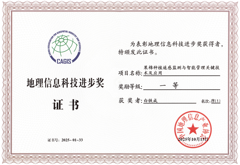 近日,中国地理信息产业协会正式公布2025年度地理信息科学技术奖励名单。我校网络安全学院、塔里木绿洲农业教育部重点实验室白铁成教授团队牵头完成的《果棉种植遥感监测与智能管理关键技术及应用》项目获得地理信息科技进步奖一等奖。