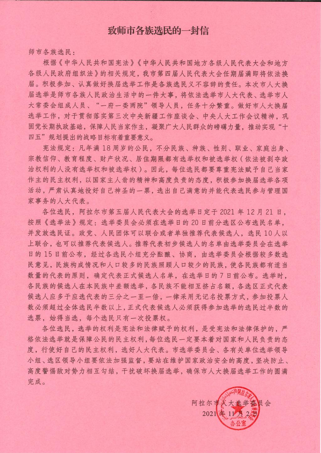 阿拉尔市选举委员会公告 致师市各族选民的一封信