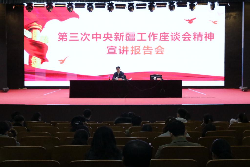 11月18日下午,党委书记赵光辉为人文院党员干部和师生宣讲第三次中央新疆工作座谈会精神。宣讲报告会由人文院党委书记张理主持,在行政楼报告厅举行。