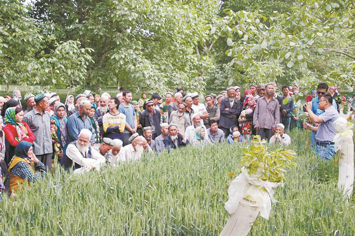 塔里木大学专家高山(前右一)在和田县给当地农民传授小麦种植技术(资料图片)。