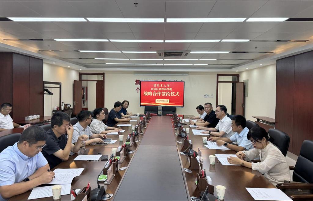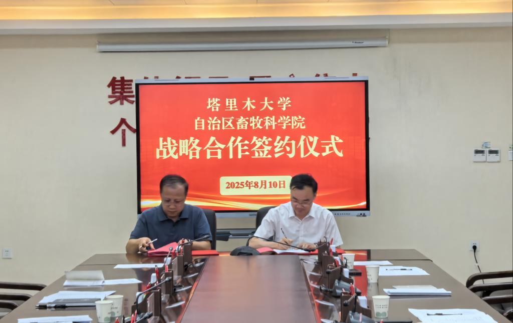 8月10日,塔里木大学与自治区畜牧科学院召开座谈会并签订战略合作协议。塔里木大学党委副书记、校长闫祥林,党委副书记于军,新疆维吾尔自治区畜牧科学院党委书记、副院长高宁,党委副书记、院长王金泉,党委委员、副院长高维明等领导参加。