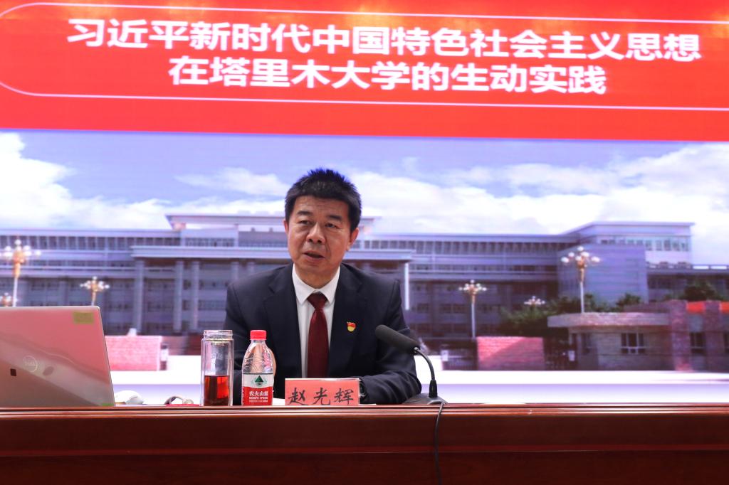 赵光辉指出,要认真学习贯彻习近平新时代中国特色社会主义思想和党的二十大精神,弘扬伟大建党精神,传承红色基因,发扬优良作风,弘扬民族精神和时代精神,践行胡杨精神和兵团精神,强化为党育人、为国育才的导向,全面贯彻党的教育方针,坚持用胡杨精神育人、为兴疆固边服务,坚持扎根南疆大地办大学,在履行兵团职责使命、落实新疆工作总目标、实现中华民族伟大复兴中创造新辉煌。