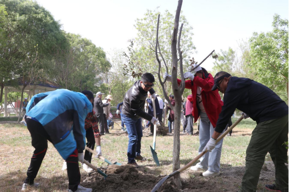 党委书记赵光辉,党委常委、副校长赵峰华、于军、石长青,同银龄教师、援疆干部一起参加植树活动。