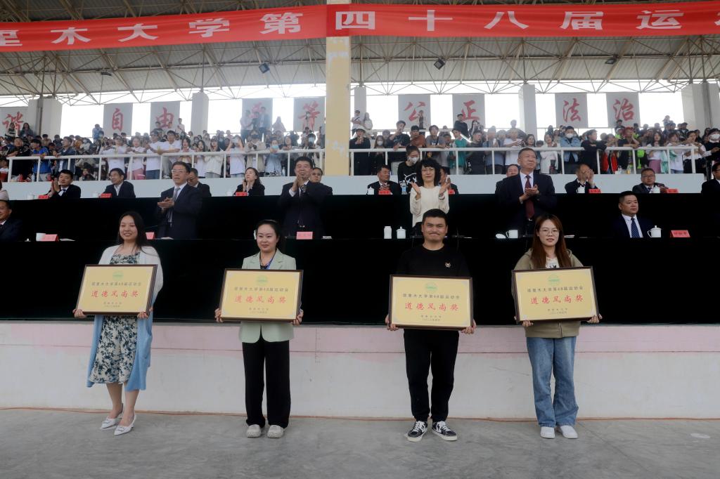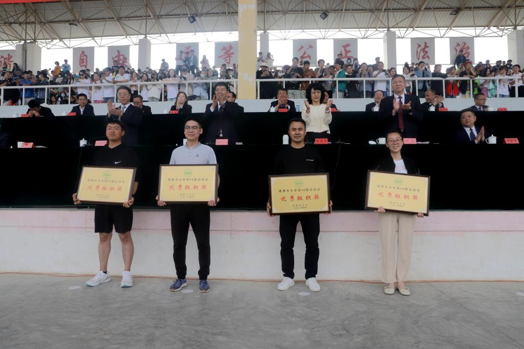 与会校领导为本届校运会团体总分前六名和“精神文明奖”、“优秀组织奖”的获奖单位,以及优秀裁判员、优秀记者、优秀志愿者进行了颁奖。