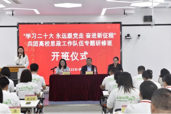 5月22日,兵团高校思政工作队伍“学习二十大 永远跟党走 奋进新征程”专题研修班在山东大学中心校区培训楼正式开班。塔里木大学党委常委、副校长石长青,兵团教育局思政处处长金亚丽,山东大学马克思主义学院党委书记马晓琳,山东大学马克思主义学院教师代表,兵团九所高校专职思政课教师、辅导员、学生思想政治教育工作者50余人参加开班仪式。